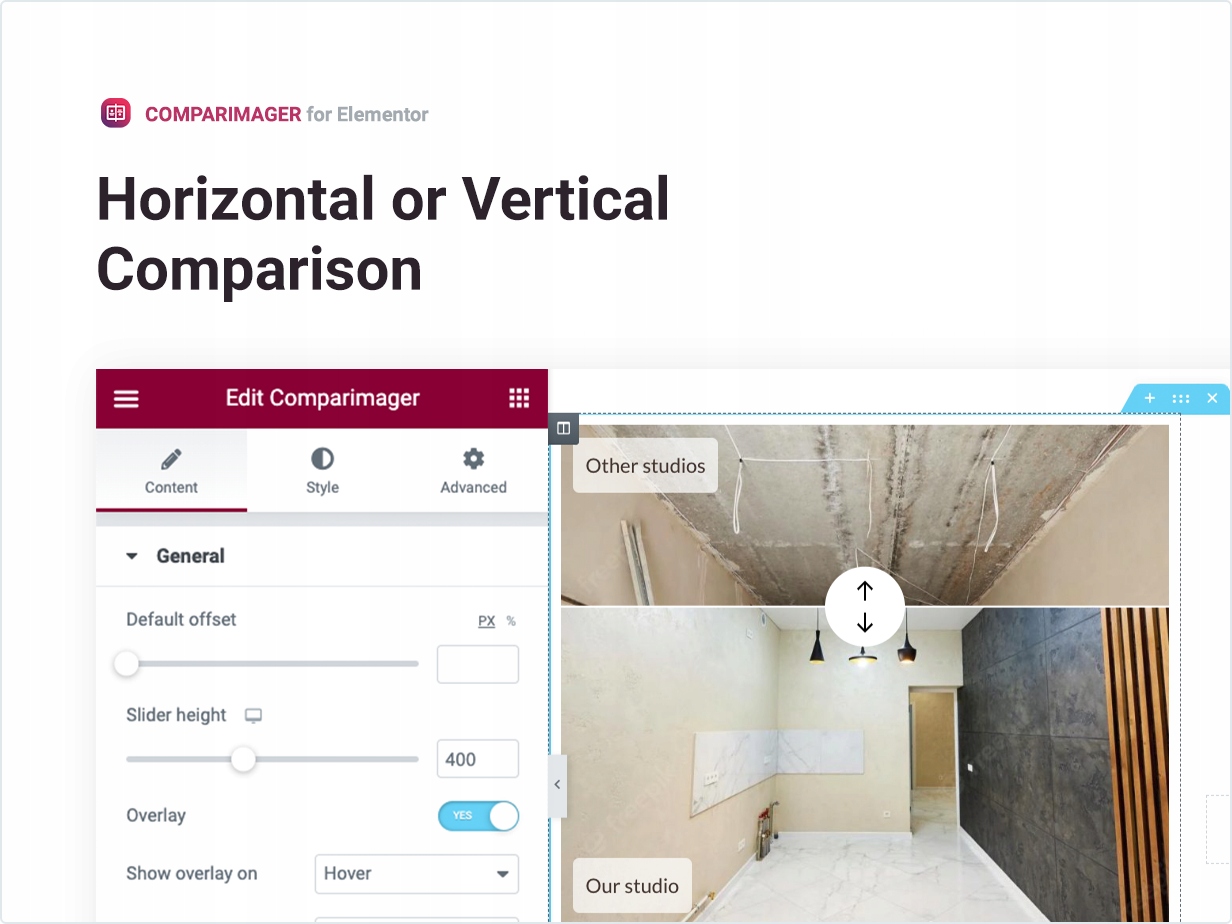 Po instalacji wtyczki w panelu Elementora możesz wstawić porównanie obrazów i dodać nieograniczoną liczbę takich porównań na jednej stronie. Użytkownik może przesuwać suwak horyzontalnie lub wertykalnie (poziomo lub pionowo), w zależności od tego, co wybierzesz.