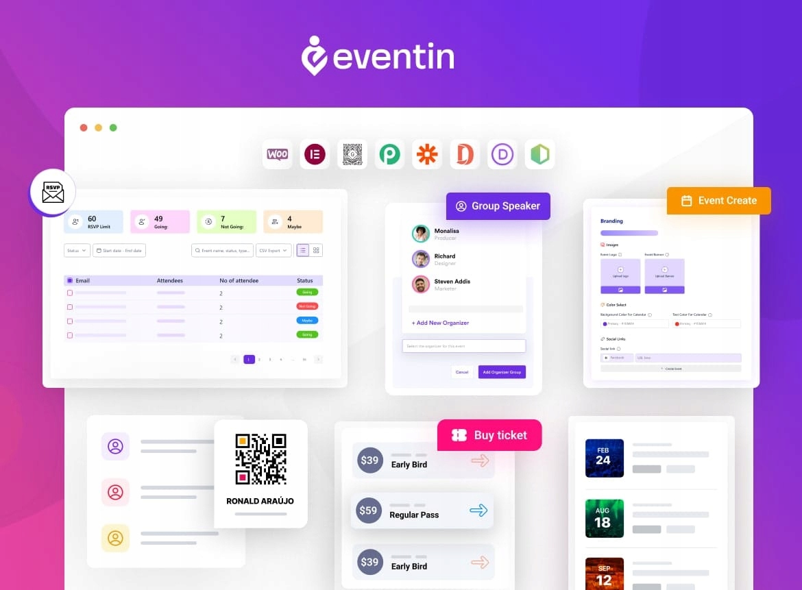Eventin to zaawansowana wtyczka WordPress CodeCanyon, która pozwala tworzyć, zarządzać i sprzedawać bilety na wydarzenia – zarówno jednorazowe, jak i cykliczne – bez wychodzenia ze strony WooCommerce.